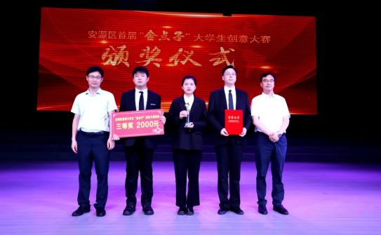 副区长严楠,我校创新创业学院副院长宋杰光为安源区首届“金点子”大学生创意大赛百废变新透水宝(三等奖)颁奖。