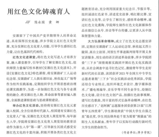 近日,中共江西省委机关刊物《当代江西》2022年第4期(总第208期)“传承红色基因”专栏刊发我校陈永国、黄娜撰写的《用红色文化铸魂育人》署名文章。
