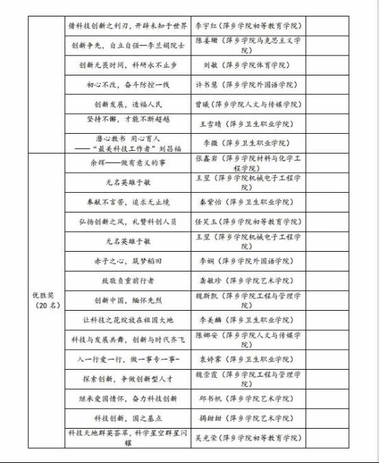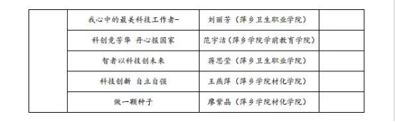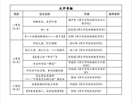 近日,由市科协、市教育局主办的2022年“科技工作者风采”征文活动中,我校荣获大中专组一等奖3个,二等奖5个,三等奖7个,优秀奖16个。其中来自材料与化学工程学院谢伊青、初等教育学院张东蓉、初等教育学院阴娜包揽大中专组全部一等奖,另有28位同学分别获得二、三等奖以及优胜奖。