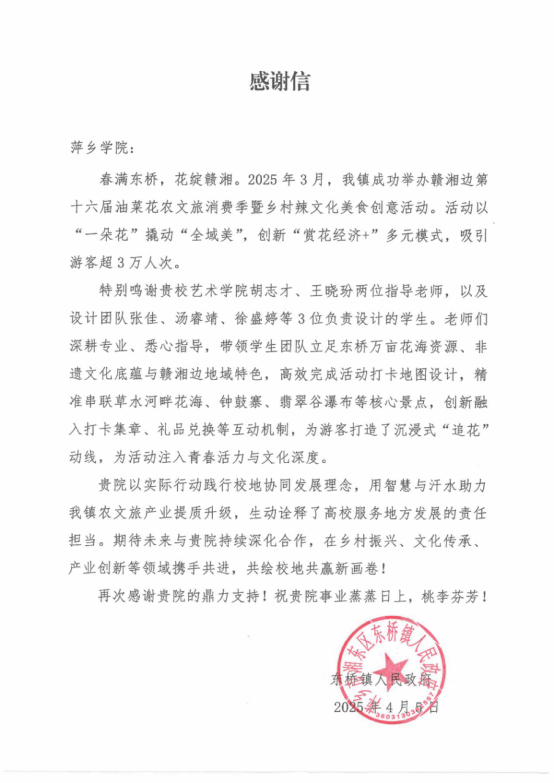 东桥镇政府在感谢信中特别指出,萍乡学院以实际行动践行了校地协同发展的理念,用智慧与汗水助力了当地农文旅产业的提质升级,生动诠释了高校服务地方发展的责任担当,并表达了未来持续深化合作,在乡村振兴、文化传承、产业创新等领域携手共进的强烈愿望。