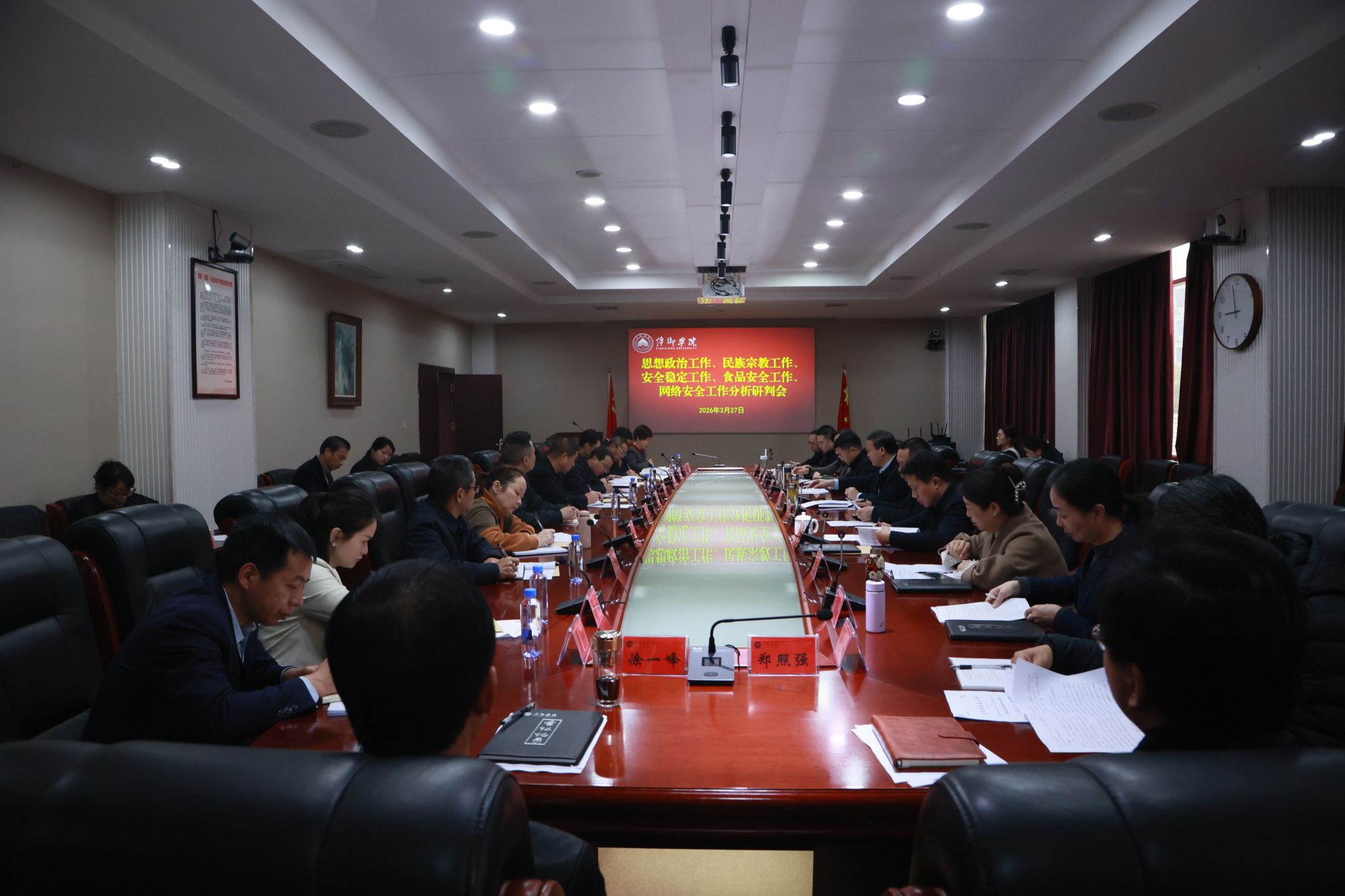 3月27日,我校在至善楼第一会议室召开思想政治工作、民族宗教工作、安全稳定工作、食品安全工作、网络安全工作分析研判会。校领导陈永国、刘培圣、王林清、曾敏、贺晓梅出席会议。人事处、学工处、保卫处、后勤处、网络与教育技术中心等相关部门负责人以及二级学院党委书记参加会议。会议由党委副书记陈永国主持。
