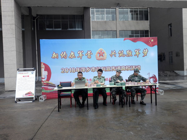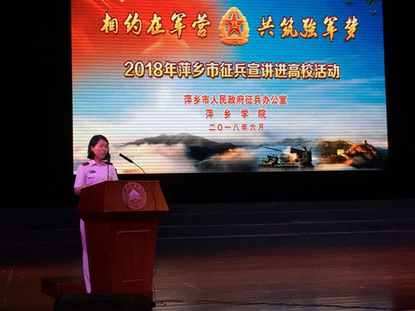 相约在军营,共筑强军梦。6月1日,由江西省萍乡市人民政府征兵办公室、萍乡学院共同举办的2018年萍乡市征兵巡回宣讲进高校活动在我院音乐厅举行,标志着我市大学生征兵宣传工作正式拉开帷幕。萍乡军分区司令员谢土生、市政府副秘书长李洪、省军区动员局参谋邓育新、萍乡学院副院长刘卫林及萍乡地区各高校人武部负责同志出席此次活动。江西省工业工程职业技术学院、江西应用工程职业技术学院和萍乡学院学生代表共计700余人聆听了此次宣讲。