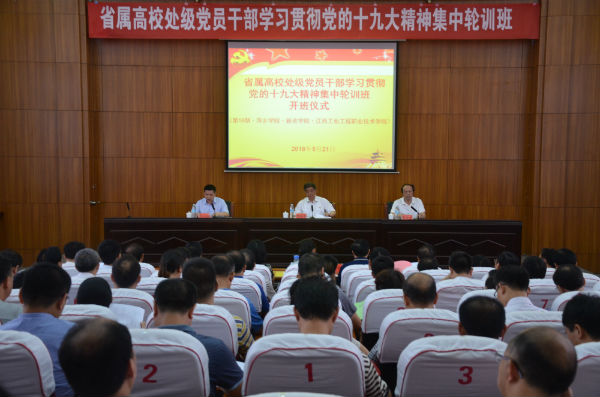 为深入学习宣传贯彻党的十九大精神,教育引导广大党员干部把思想和行动统一到党的十九大精神上来,5月21日,省属高校处级党员干部学习贯彻党的十九大精神第十八期集中轮训班在我校至善楼学术报告厅开班。江西省高校思想政治理论课教学指导委员会主任、江西省教育厅原巡视员周金堂出席并作动员讲话。党委书记陈金印致辞。萍乡学院、新余学院以及江西工业工程职业技术学院共计130余人参加。开班式由省委教育工委党校副校长杨小东主持。