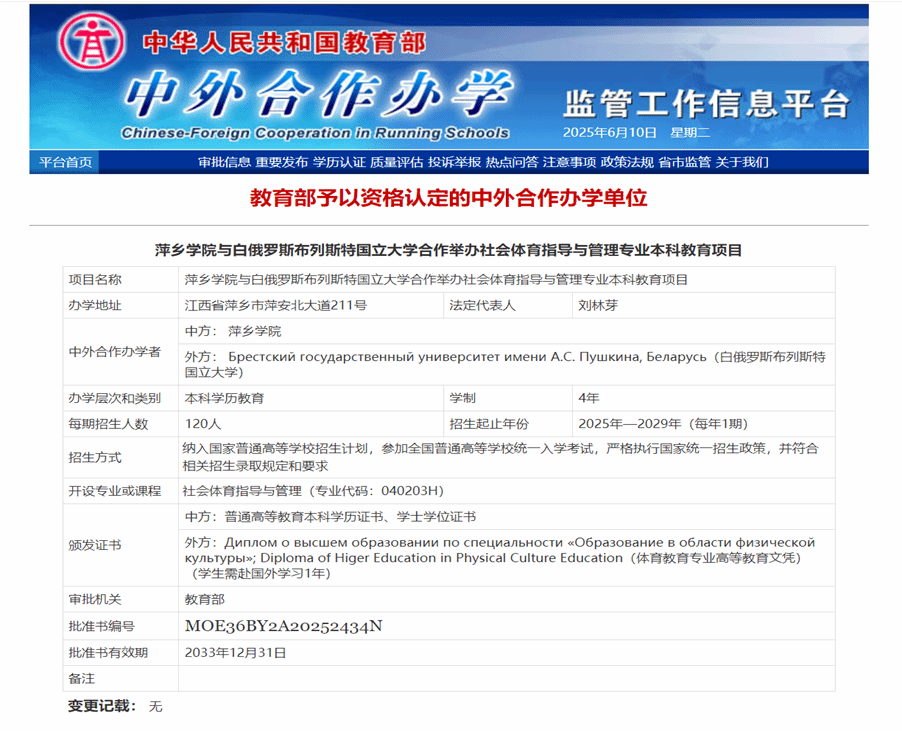 萍乡学院与白俄罗斯布列斯特国立大学合作举办社会体育指导与管理专业本科教育项目是经中国教育部批准的中外合作办学项目(批准书编号:MOE36BY2A20252434N)(以下简称“本项目”)。