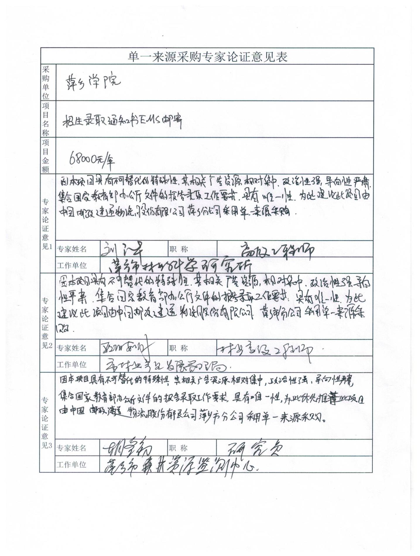 附件:招生录取通知书EMS邮寄单一来源专家论证意见