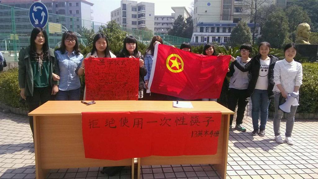 3月,是雷锋月,是为了纪念雷锋的感人事迹,为了鼓励广大的人们多做善事而特定设立的。在这个月会有各种活动来发扬雷锋精神,当然,在学校也一样。3月 17日,萍乡学院外语系13英本4班的同学们发起了一场拒绝使用一次性筷子的倡议活动。经过一系列准备工作后,这场具有实际意义的活动终于正式出炉。