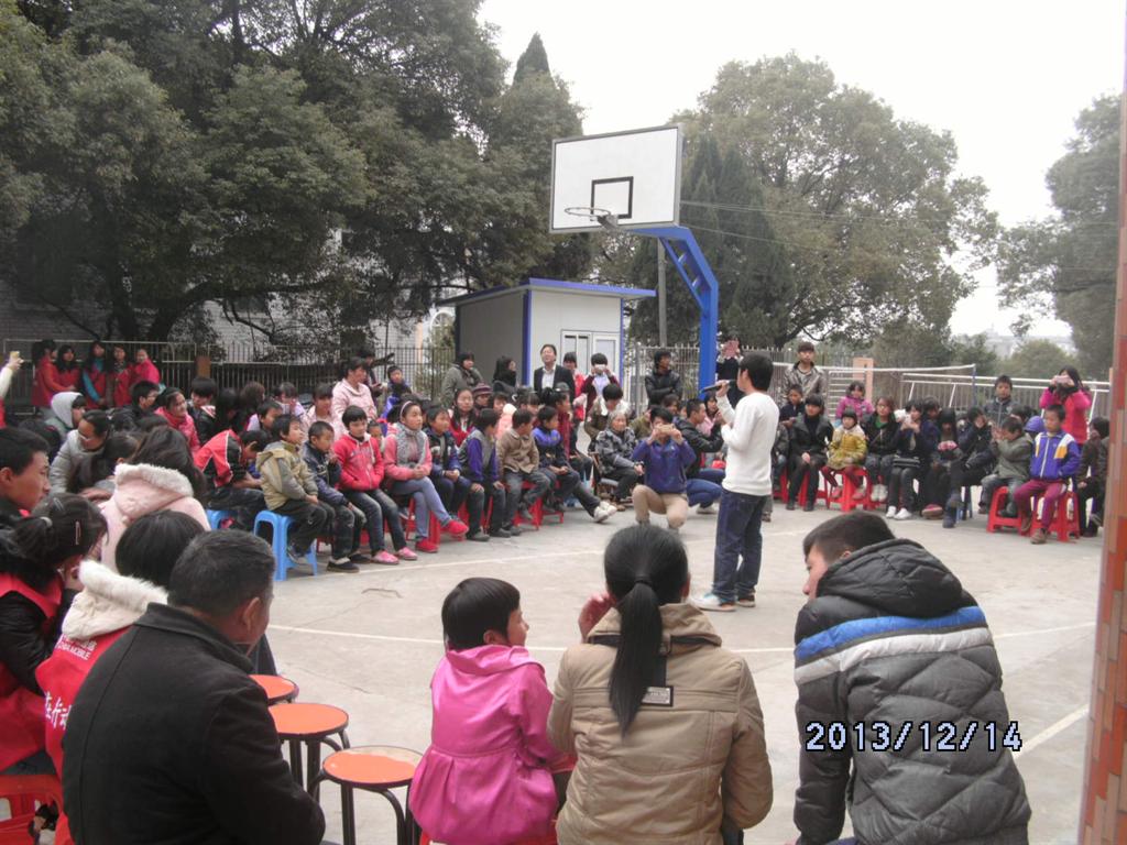 下午13:30,大家开始表演节目,一首热情洋溢的歌曲让各位小朋友们欢乐起来,吉他社一支极具古典韵味的《静夜思》舞蹈让大家陶醉,随后在凳子这个互动小游戏中,小朋友围着凳子欢腾的抢着,一个个敏捷的“抢”。拿到小奖品时脸上都洋溢着开心的笑容,各位小朋友在台下非常活跃,不断有小朋友要求要上台表演会节目,15:20演出结束后志愿者们和小朋友门相互交谈做小游戏,16:20活动结束,小朋友门依依不舍一直送到志愿者们上车。