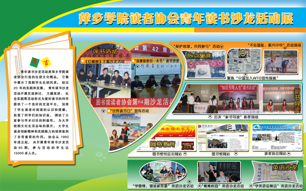 在校团委和图书馆的指导下,青年读书沙龙活动自1993年开展以来,以“加强大学生思想政治教育”为出发点,以“提升高校精神文化氛围”为着力点,现已发展成一项影响广、深受师生好评的校园文化精品活动。通过20年的实践和发展,青年读书沙龙活动开展交流研讨、主题巡讲、社会实践等活动形式为爱好读书的同学提供了一个良好的交流平台,加深了学生读者对阅读的认识和理解,拓宽了同学们的知识面,调动了大家参与学术讨论的积极性,为大学校园文化生活品味的提升,大学生读者创新精神和实践能力的培养方面都取到了重要的作用。