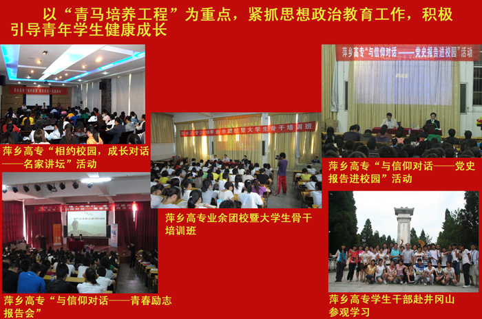 近年来,萍乡高专团委在团省委、团市委的指导下,在学校党委的正确领导下,坚持以巩固党在青年中的群众基础与阶级基础为最终目标,积极探索共青团组织服务青年的有效途径和手段,坚持以“青马培养工程”、“一团一品工程”、“亮出团旗工程”、“三千实践工程”为抓手,以青年网和微博为主阵地,在思想引领、成长服务、组织建设、落实团省委、团市委工作任务及本校开展的特色工作等方面取得了一系列可喜的成绩,得到了团中央宣传部领导、团省委、团市委主要领导的充分肯定。团省委对2011年全省50多所高职专科院校共青团工作考核情况进行了通报,萍乡高专共青团工作表现优异,综合考评得分91.4分,进入前三甲,我校共青团工作跻身全省同类高校前列。