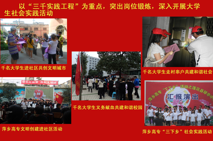 近年来,我们着力实施了“千名大学生义务献血共建和谐校园”,“千名大学生进社区共创文明城市”,“千名大学生走村串户共建社会主义新农村”活动,突出了实践环节,提高了当代大学生思想道德素质和自觉奉献精神,使一大批学生在实践中得到锻炼和培养,同时,充分发挥了学生干部在大学生中的引领、示范作用。在以“三千实践工程”为重点的同时,我校还组织了一些列富有成效的社会实践活动。如建立爱心超市、开展“三下乡”、“变废为宝”、“乡村环保行”活动,成立“四城同创”服务队,等等。活动深入基层,深入农村,深入工厂车间,使大学生社会实践真正做到“沉下去”,增加大学生的内心体验,促使大学生真正融入基层、融入生活、融入社会,最终达到“受教育、长才干、做贡献”的目的。
