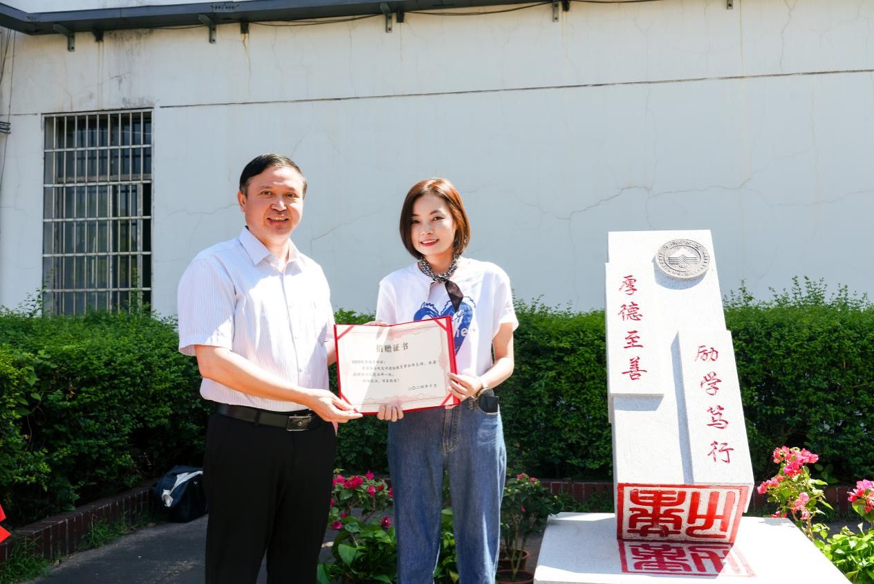 为表达对母校的感恩怀念之情,校友向母校捐赠了一座石碑。揭幕仪式由欧阳咏梅主持。校友代表介绍了石碑的内容和意义,碑的正面镌刻着校训“厚德至善 励学笃行”,寓意校友们秉承校训,在工作和生活中注重培养品德,勤奋学习并付诸实践;碑底的“勤”字印章和石碑两侧的“书山有路勤为径,学海无涯苦作舟”“业精于勤荒于嬉,行成于思毁于随”代表着校友们对学弟学妹们的期望,期望他们在求知路上保持勤奋与思考。陈永国、贺晓梅与校友代表共同为石碑揭幕。陈永国发表讲话,他代表母校感谢校友的捐赠,期待校友继续关心并关注母校的建设与发展,并向校友颁发了捐赠证书。