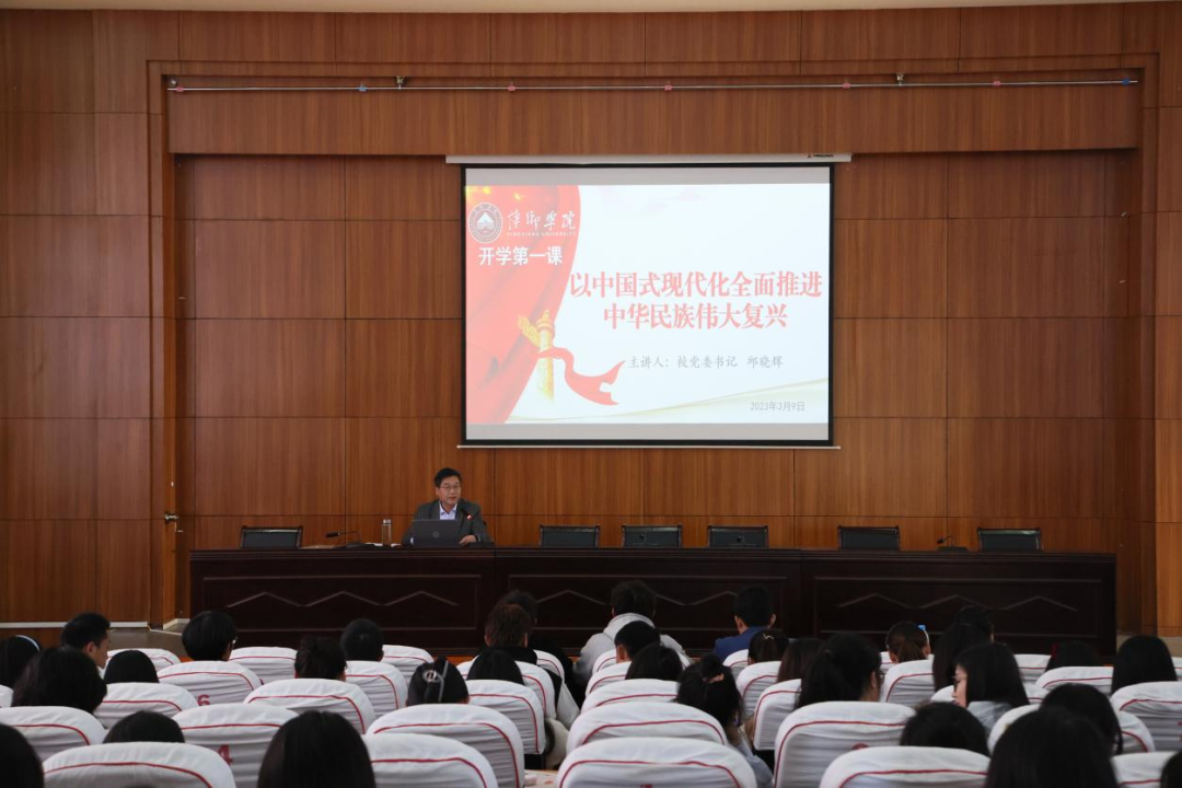 3月9日,萍乡学院党委书记邱晓辉在至善楼学术报告厅为学生讲授“开学第一课”。邱晓辉以“以中国式现代化全面推进中华民族伟大复兴”为主题,聚焦中国式现代化,立足中国发展道路,围绕推进中华民族复兴伟业进行讲授。150余名学生聆听授课。
