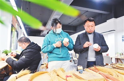 从江口村走出去的艺人张三石(右一),如今从景德镇回到村里,每日在自己的竹艺中心教村里的妇女竹编技艺。